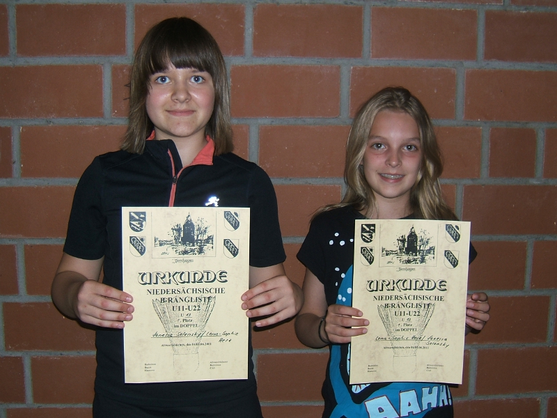 Auf der Bezirks-Doppel-Rangliste am Wochenende des 4. und 5. Juni in Altwarmbüchen könnten wir mal wieder einen Titel erringen. Lena-Sophie Herz konnte mit ihrer Partnerin Vanessa Selensky vom SC Salzgitter trotz einer schweren Auslosung die Disziplin MD U13 gewinnen. Bereits im Viertel- und im Halb-Finale trafen sie auf die an Platz 3 und an Platz 2 gesetzten Doppel. Beide Spiele konnten Lena und Vanessa in zwei Sätzen gewinnen. Im Finale spielten sie gegen die auf Platz 1 gesetzten Luca-Marie Dietz / Marie Gunda Lange vom MTV Nienburg. Und hier wurde es wesendlich knapper. In der Verlängerung des dritten Satzes konnten sich Lena und Vanessa mit 19:21, 21:15 und 22:20 durchsetzen.